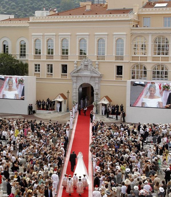 The walk with her father in square outside the church was such a thrill for the on-lookers! And provided lots of gown exposure. The 23 priests and three cardinals presented a very holy backdrop for this Catholic Mass but I know the day was marred by the rumor of Albert having fathered yet a third illegitimate child during his engagement to Charlene. That surely explained the lack of smiles.